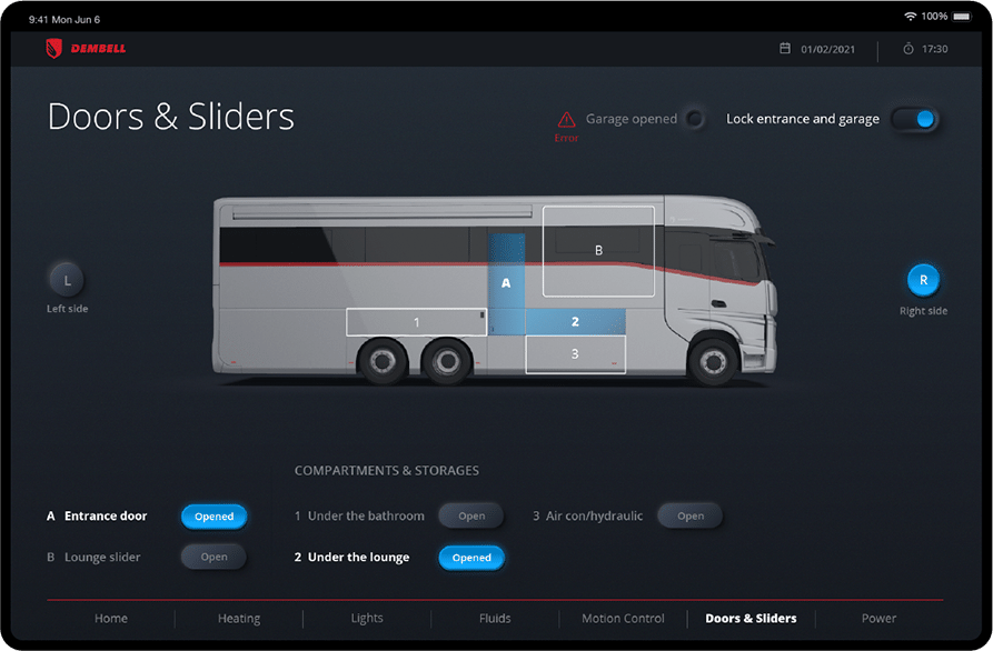 A lakóautóba belépve - vagy akár távoli vezérléssel - innen szabályozható például a fűtés és a lámpák erőssége, ellenőrizhető a tartályok töltöttségi szintje vagy az ajtók és ablakok állapota.