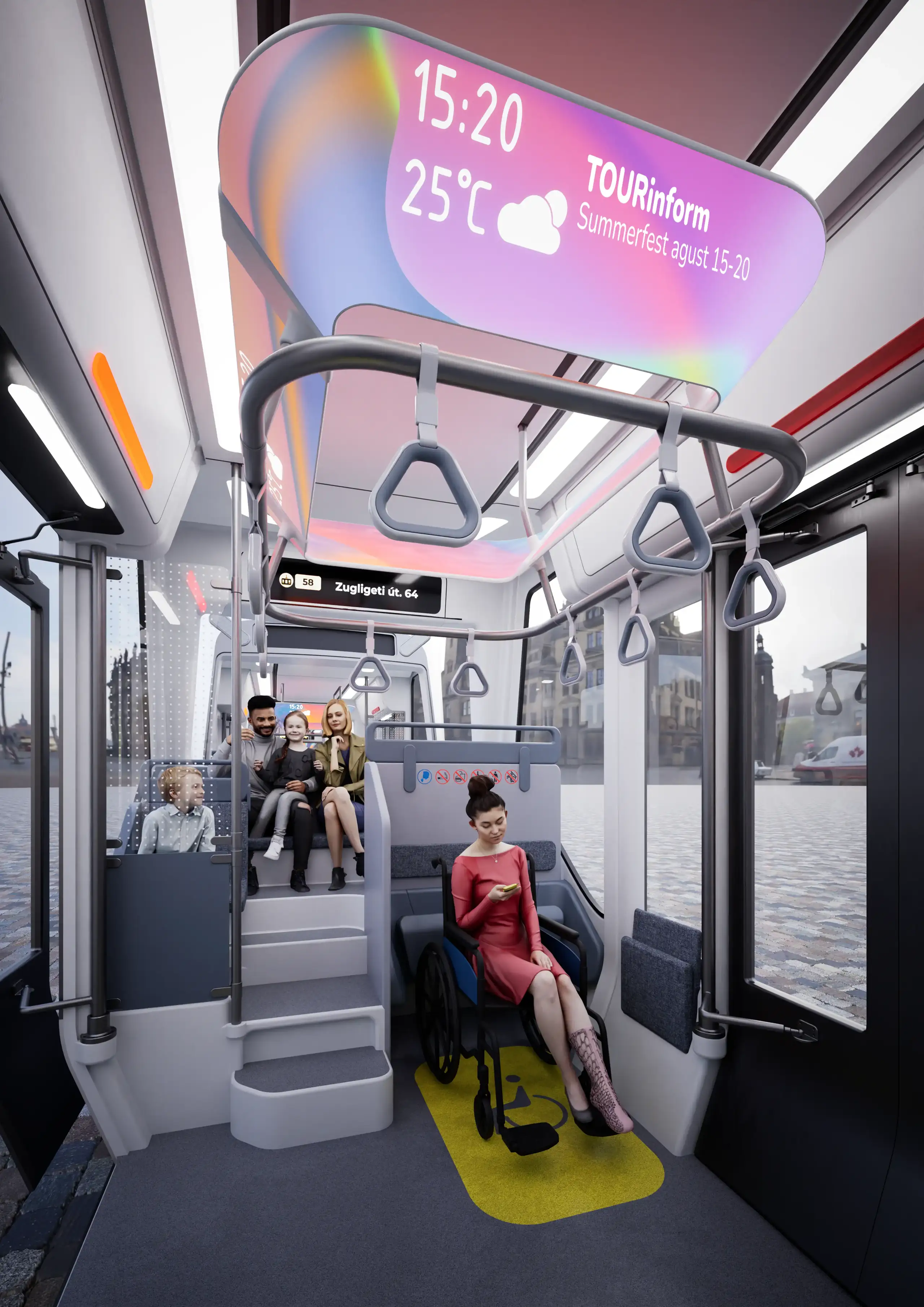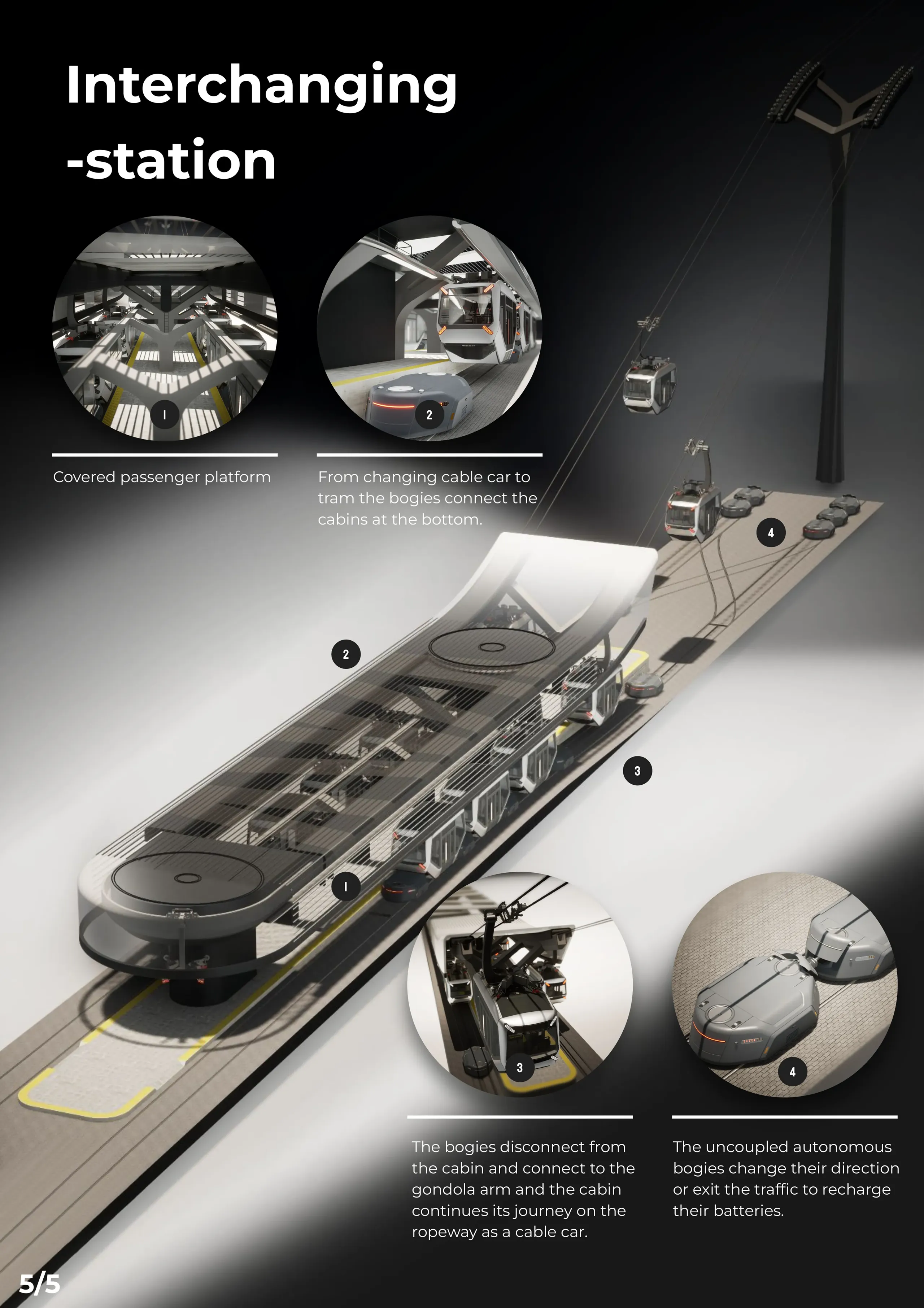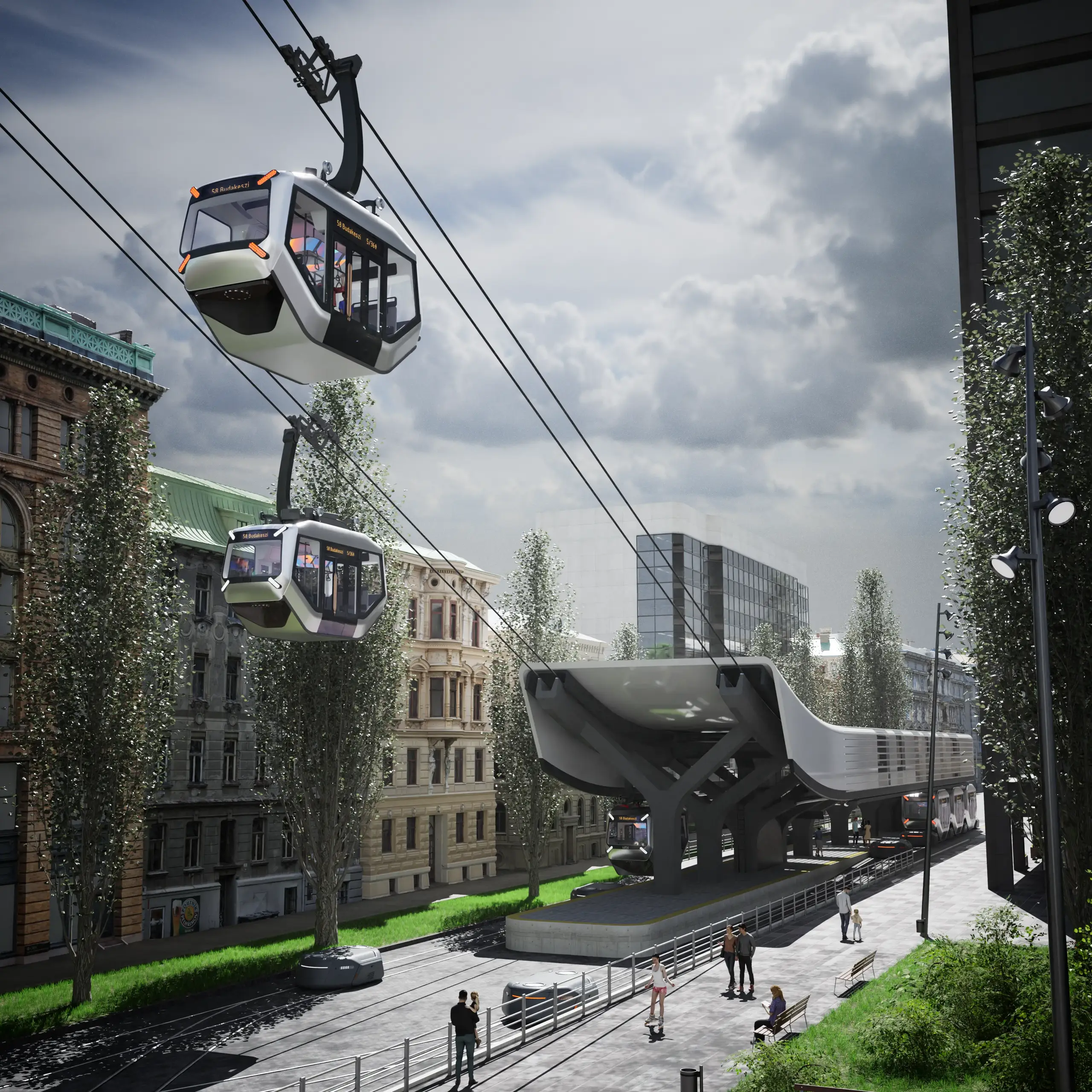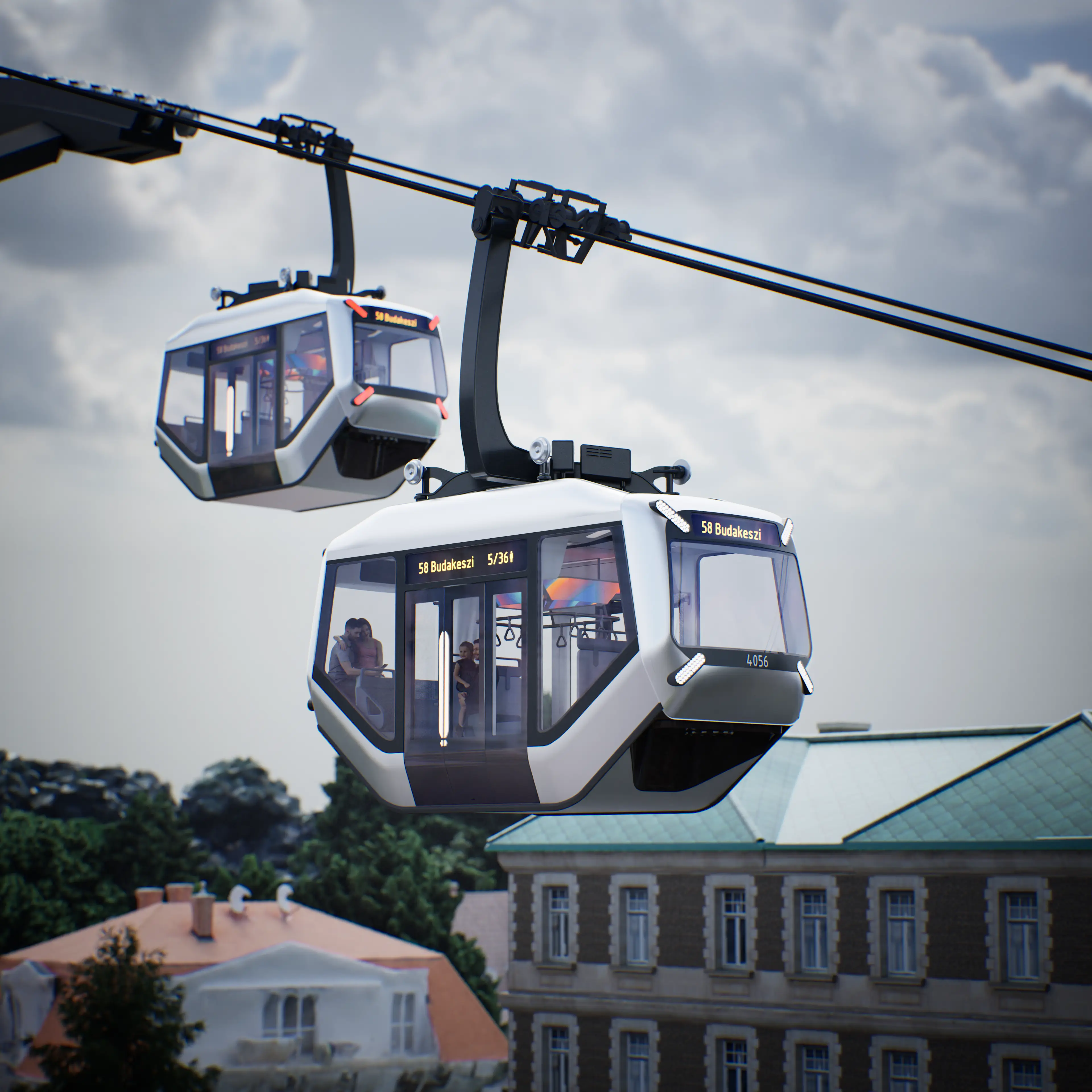 The Flytram is a tram-train system that uses existing road-rail networks in the cities and accesses poorly connected suburbs with ropeways. This vehicle is a hybrid between a tram and a cable car. It aims to lessen the number of transfers and costs, resulting in a more competitive traffic system. The passenger cabin can be connected to the autonomous rail bogie at the bottom, and a ropeway-connected gondola arm on the top.