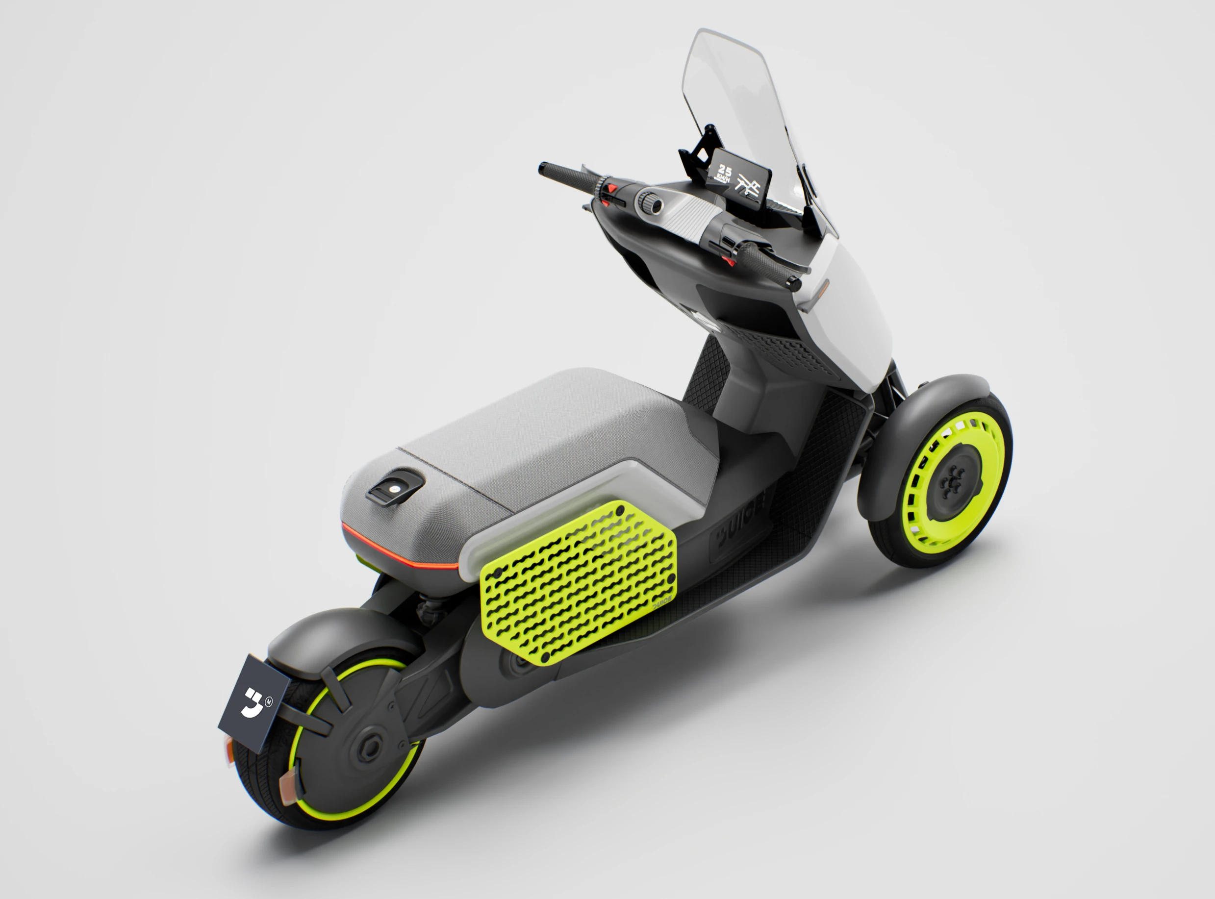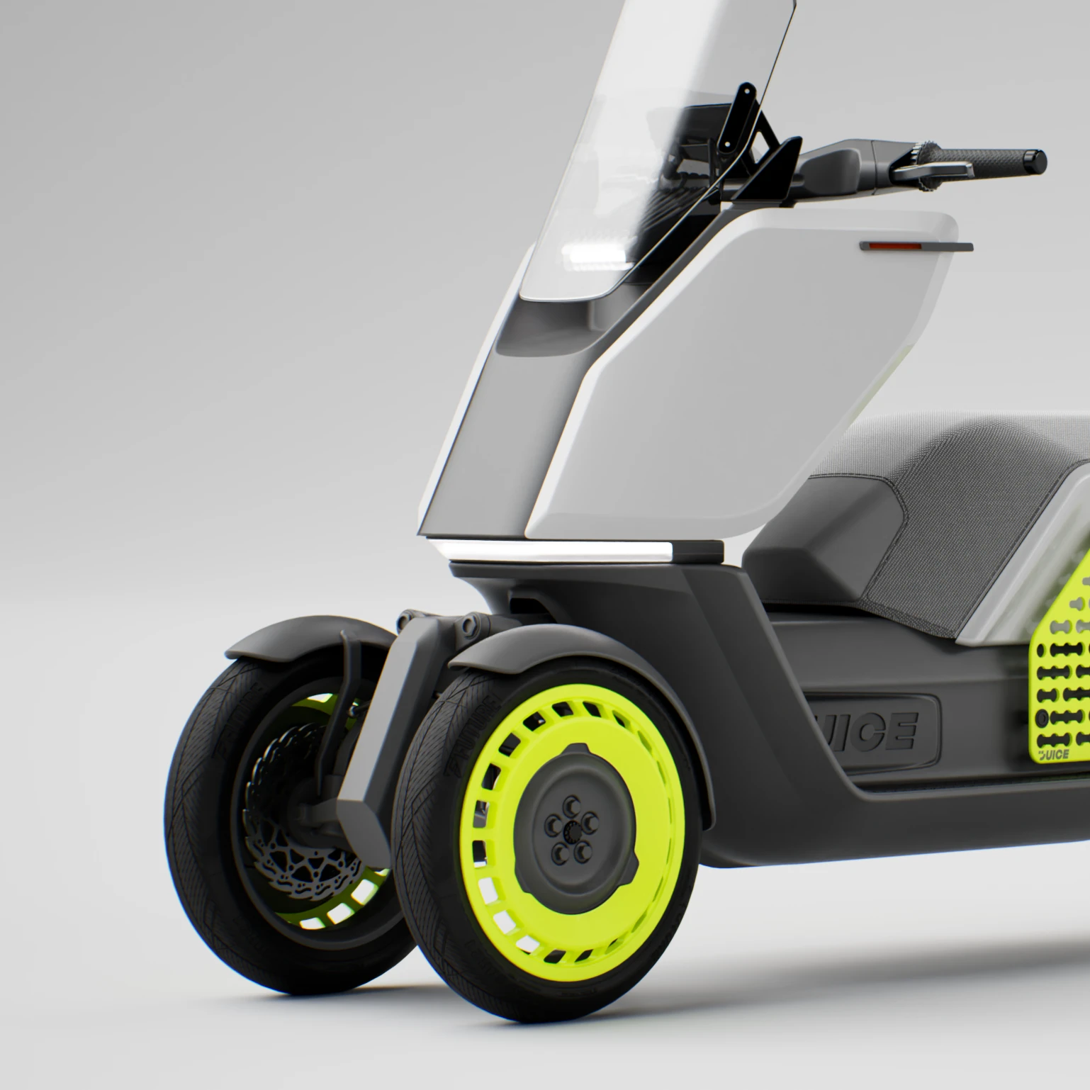 The Juice Maxi is a next-generation electric scooter that combines the stability and safety of a three-wheeled architecture with the freedom of urban mobility. The project is part of Juice Mobility’s development line exploring reverse trike platforms — vehicles positioned at the intersection of practical functionality and the joy of movement in city environments. Its tilting front suspension and low center of gravity provide a strong sense of control and confidence in every situation, while the distinctive side L-track cargo panel serves as both a functional element and a visual signature. It references the brand’s cargo roots while giving the vehicle a bold, recognizable character.